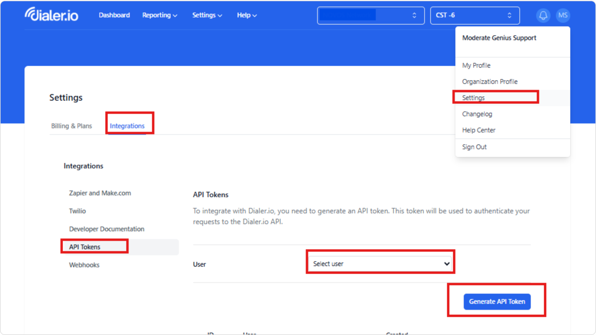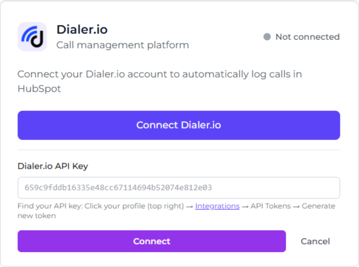 - Generate an API token inside Dialer.io - Settings -> Integrations -> API Tokens