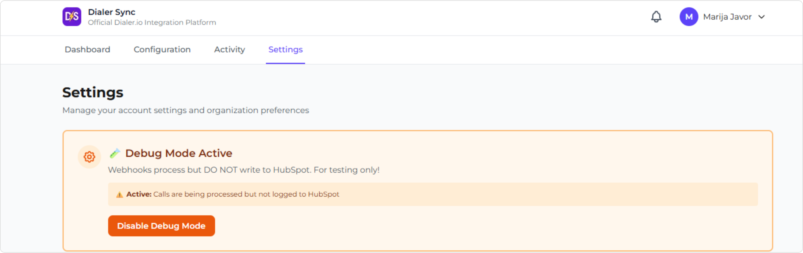 Debug Mode allows Dialer Sync to process calls without writing data to HubSpot. This is useful when testing a setup or validating behavior. Calls are still processed, but nothing is logged in HubSpot until Debug Mode is turned off.