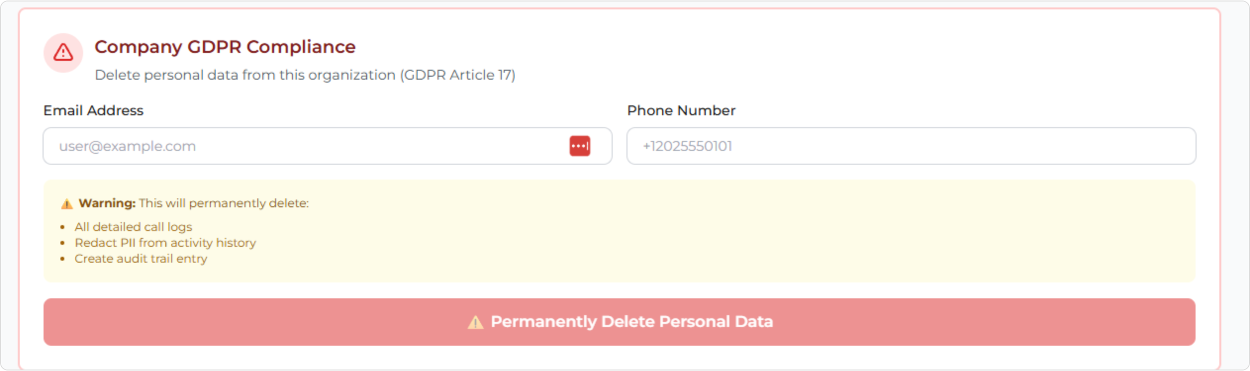 Dialer Sync includes an option to permanently delete personal data in accordance with GDPR Article 17 (Right to Erasure).